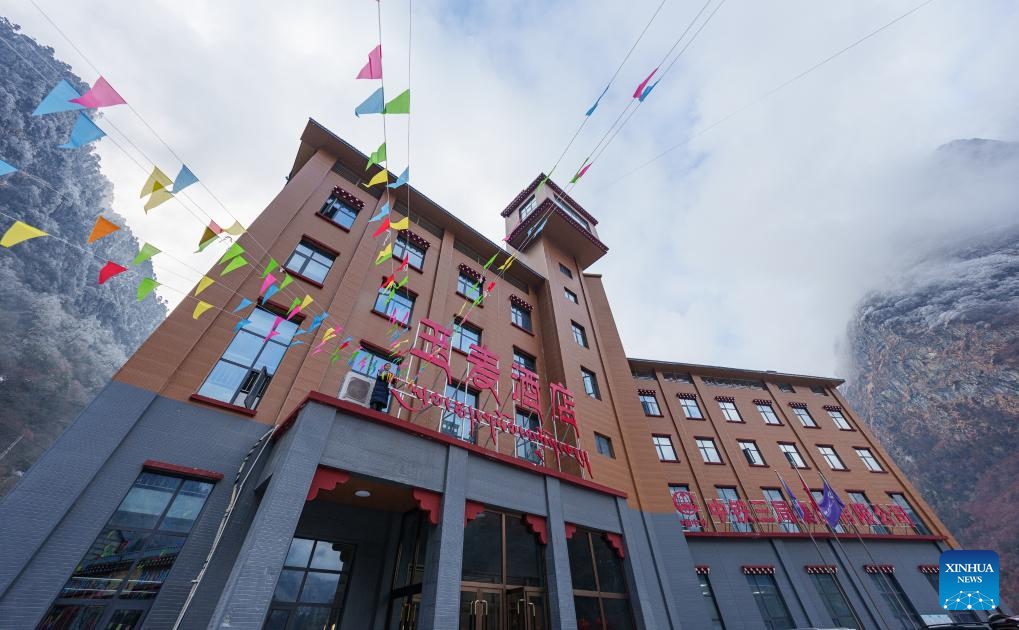 Colorful flags are hoisted outside a hotel to celebrate the upcoming Spring Festival and Tibetan New Year in Yumai Town of Lhunze County in Shannan City, southwest China’s Xizang Autonomous Region, Feb. 5, 2026. Yumai Town, located on the southern foot of the Himalayas, was once home to merely three permanent residents due to its harsh and rugged terrain. Today, residential houses here are neatly arranged, with comprehensive infrastructure including drainage and communication facilities in place.