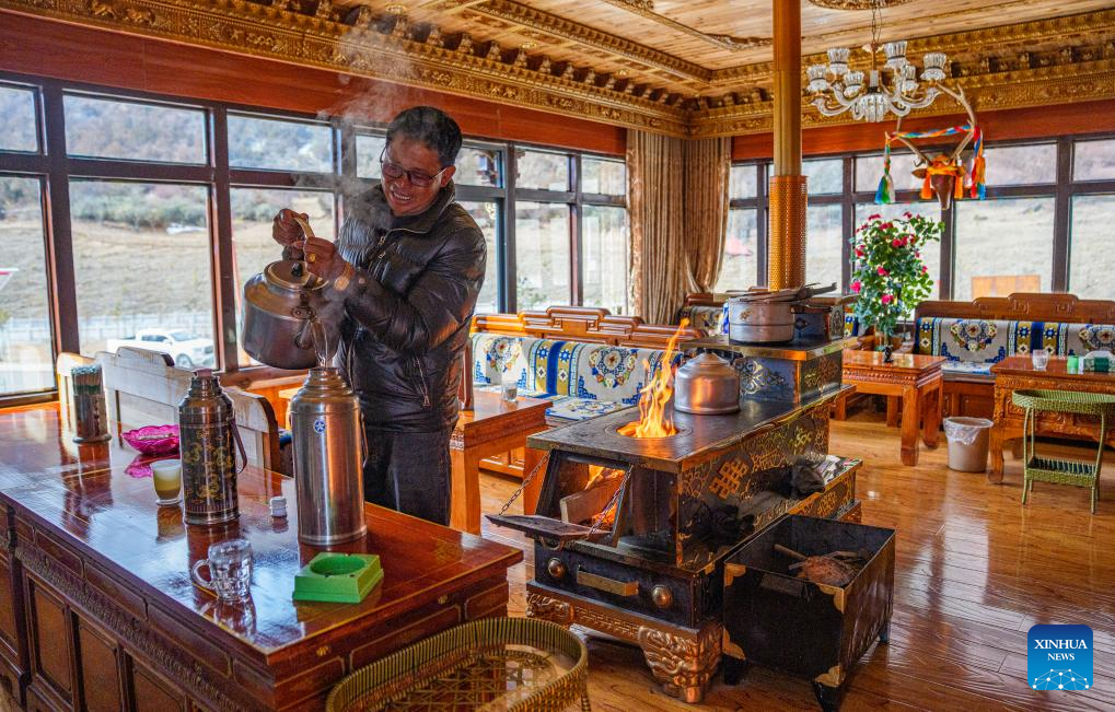 A villager works at his home-stay in Yumai Town of Lhunze County in Shannan City, southwest China’s Xizang Autonomous Region, Feb. 5, 2026. Yumai Town, located on the southern foot of the Himalayas, was once home to merely three permanent residents due to its harsh and rugged terrain. Today, residential houses here are neatly arranged, with comprehensive infrastructure including drainage and communication facilities in place.