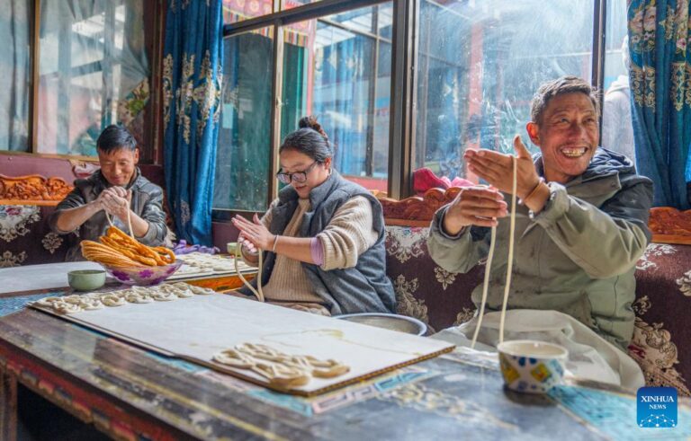 Villagers make traditional snacks for the upcoming Tibetan New Year at home in Yumai Town of Lhunze County in Shannan City, southwest China’s Xizang Autonomous Region, Feb. 5, 2026. Yumai Town, located on the southern foot of the Himalayas, was once home to merely three permanent residents due to its harsh and rugged terrain. Today, residential houses here are neatly arranged, with comprehensive infrastructure including drainage and communication facilities in place.