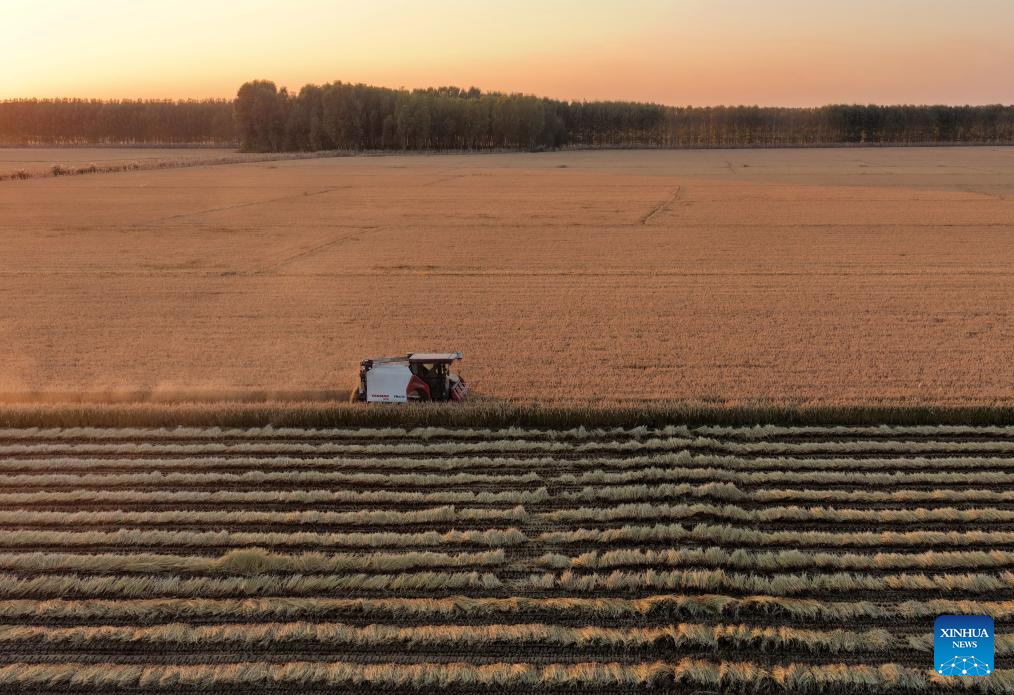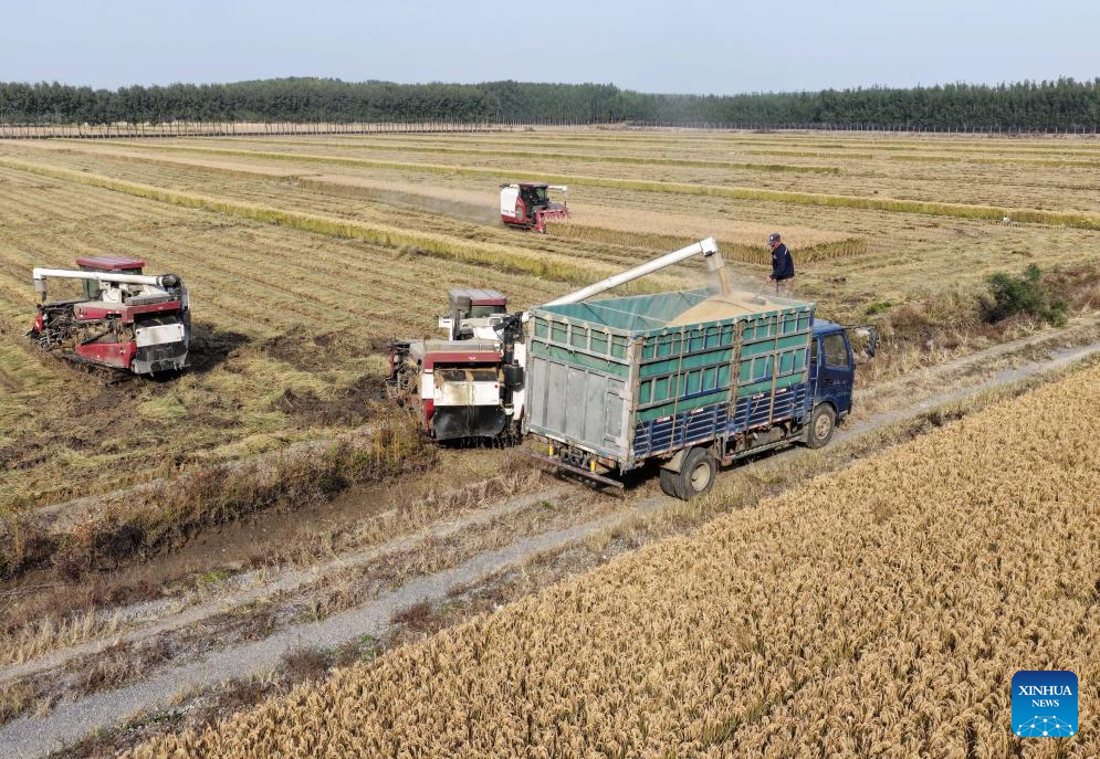 An aerial drone photo taken on Oct. 27, 2025 shows farmers harvesting rice in a field in Fengnan District of Tangshan City, north China’s Hebei Province. The rice harvest season has arrived in Tangshan City, where farmers are seizing the good weather to accelerate harvesting. (Xinhua/Yang Shiyao)