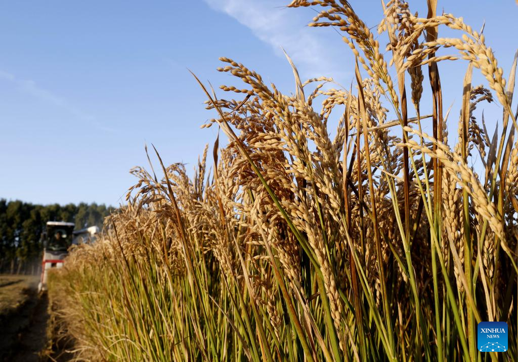 A farmer harvests rice in a field in Fengnan District of Tangshan City, north China’s Hebei Province, Oct. 27, 2025. The rice harvest season has arrived in Tangshan City, where farmers are seizing the good weather to accelerate harvesting. (Xinhua/Yang Shiyao)