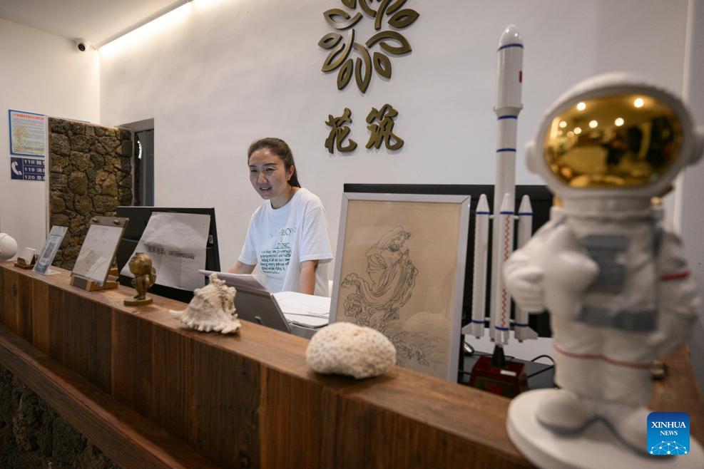 A homestay owner works at her reception desk in Longlou Town of Wenchang City, south China’s Hainan Province, Dec. 24, 2025. (Xinhua/Pu Xiaoxu)