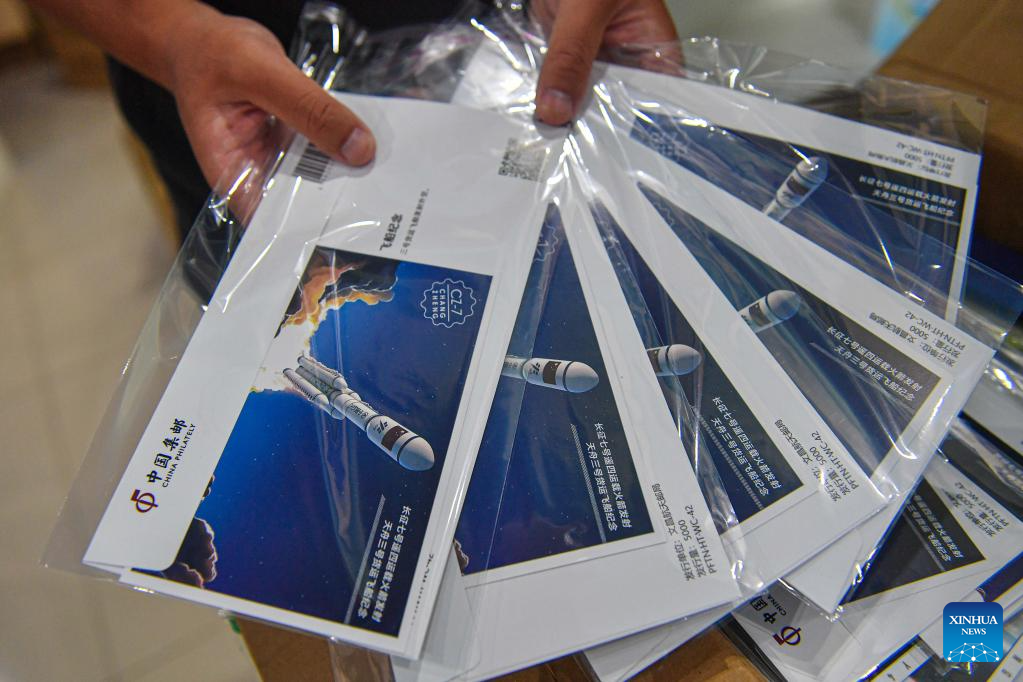 Yang Hao, an aerospace enthusiast, shows the aerospace commemorative philatelic collections he purchased in Wenchang, south China’s Hainan Province, Sept. 19, 2021. (Xinhua/Pu Xiaoxu)