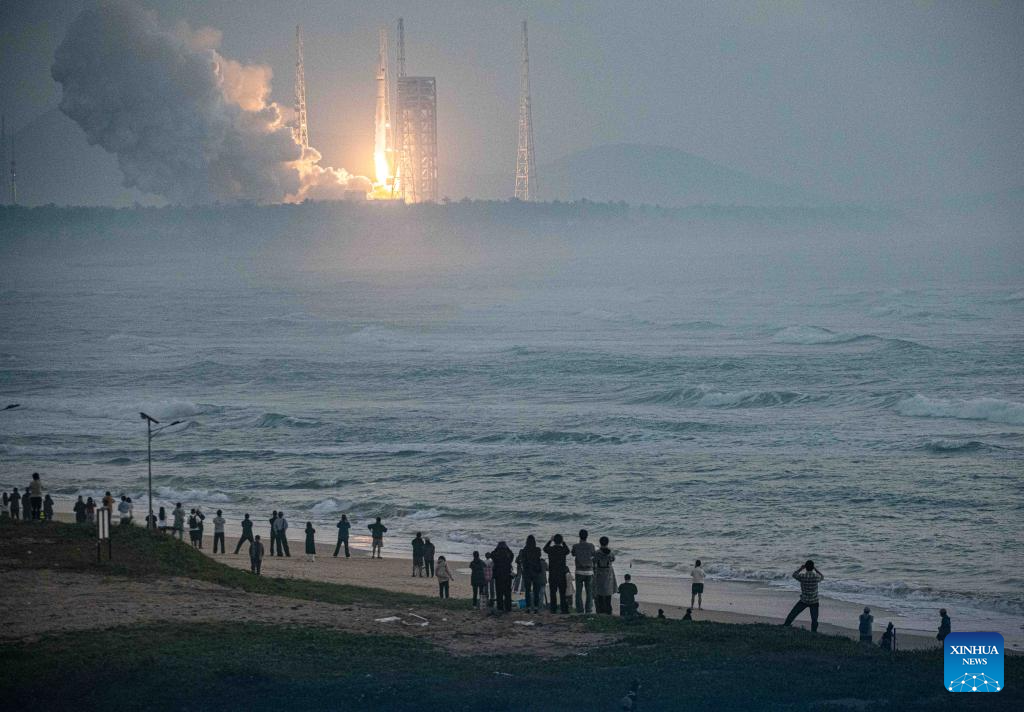 People watch a rocket blasting off from the Hainan commercial spacecraft launch site in Wenchang, south China’s Hainan Province, Dec. 12, 2025. (Xinhua/Pu Xiaoxu)
