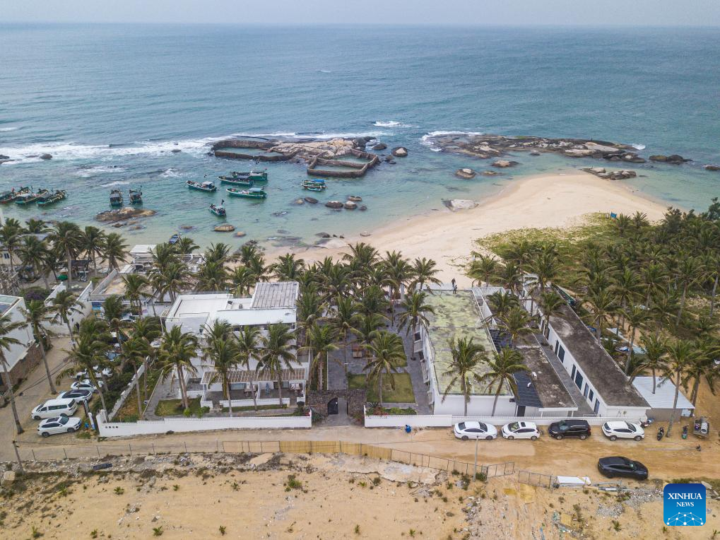 An aerial drone photo taken on Dec. 26, 2025 shows a homestay on the beach in Longlou Town of Wenchang City, south China’s Hainan Province. (Xinhua/Pu Xiaoxu)