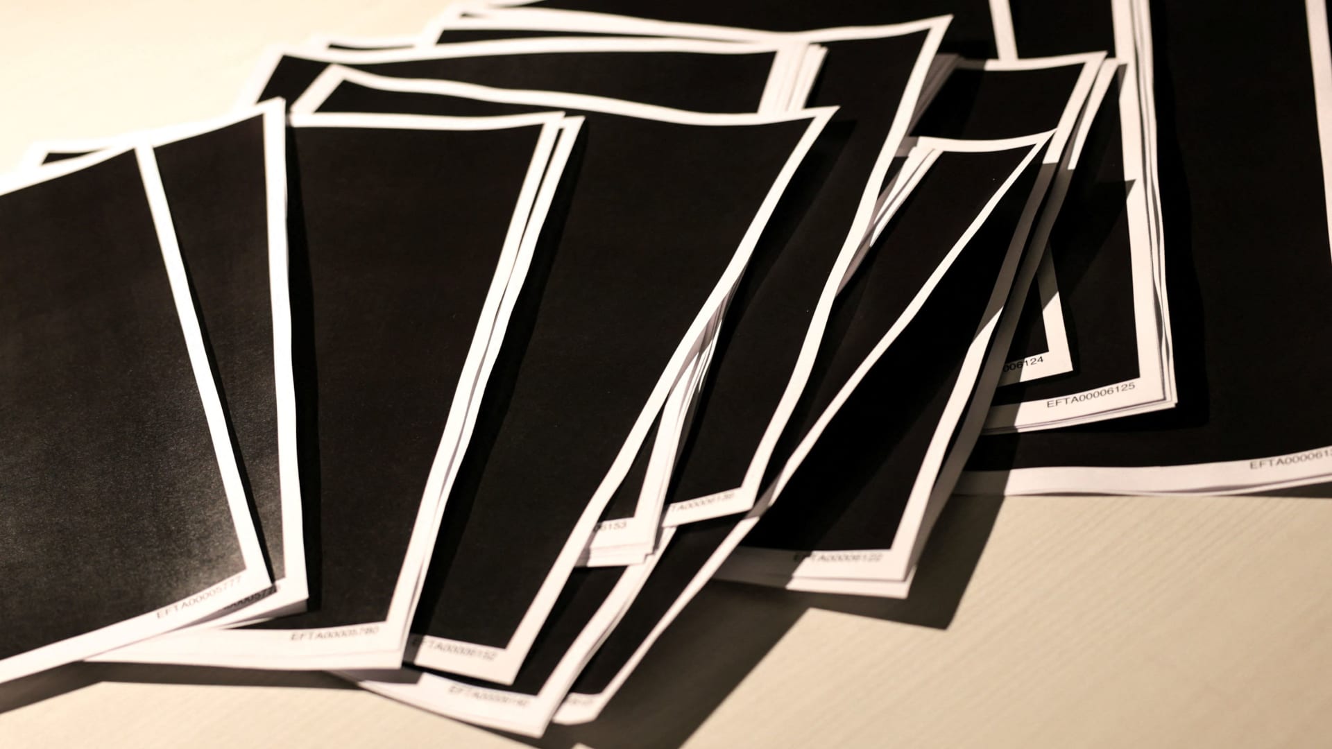 Newly-released documents from disgraced late financier and sex offender Jeffrey Epstein, including a sheaf of entirely redacted pages, are seen in handouts released by the Justice Department and printed and arranged for a photograph by Reuters in Washington, Dec. 19, 2025.