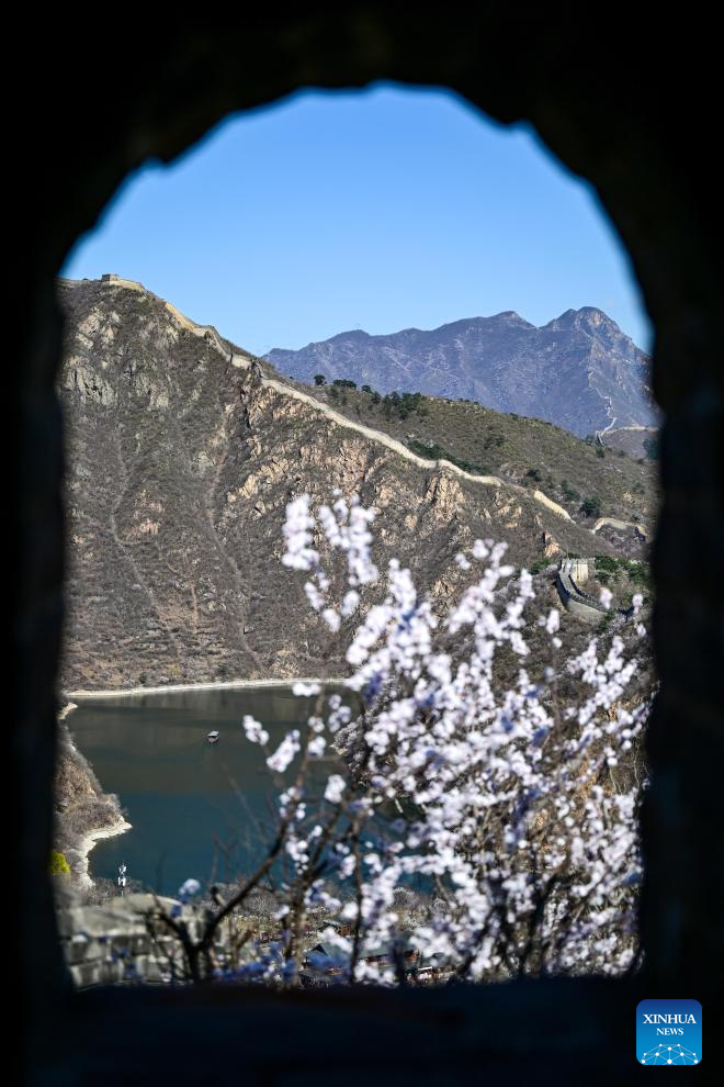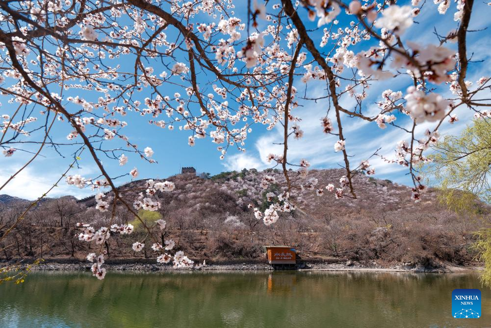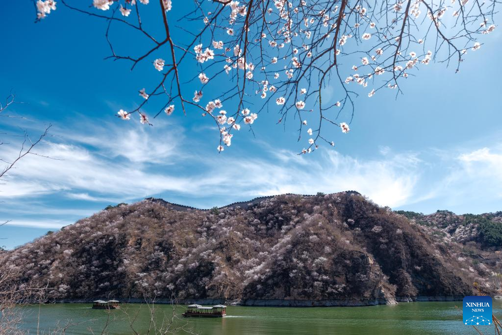 This photo taken on April 1, 2026 shows blooming flowers at Huanghuacheng Lakeside Great Wall in Huairou District of Beijing, capital of China. (Xinhua/Chen Yehua)