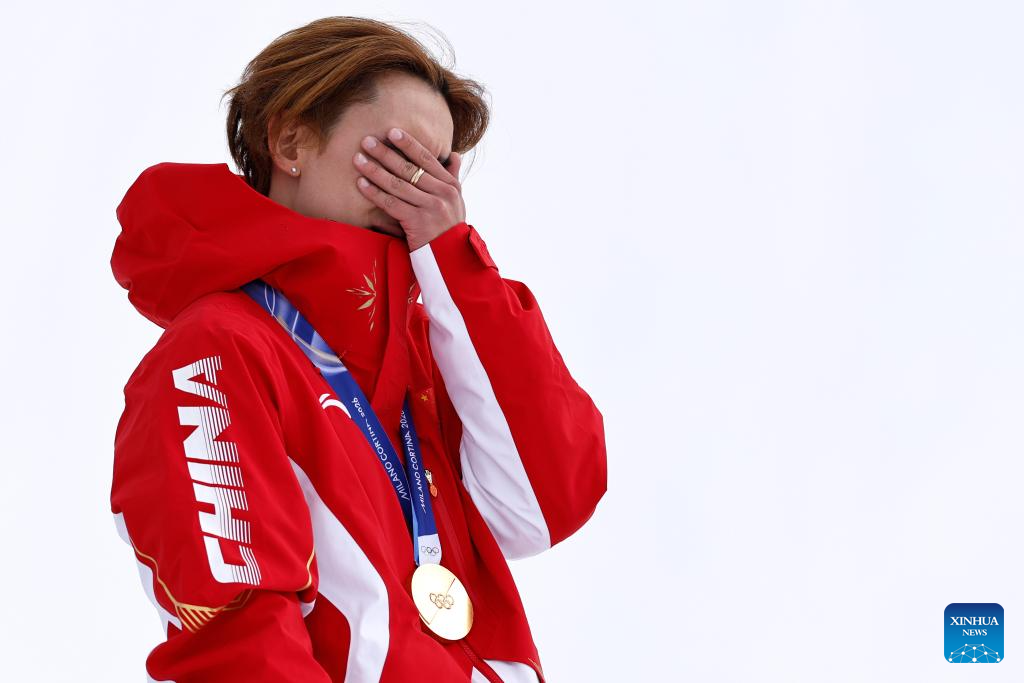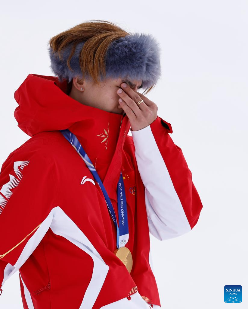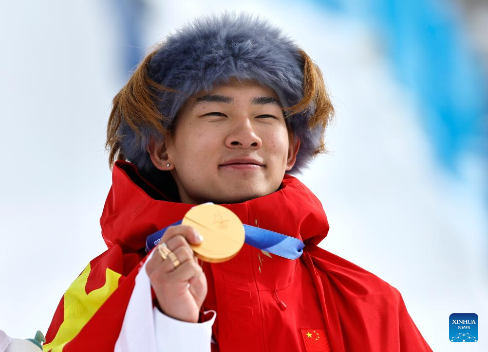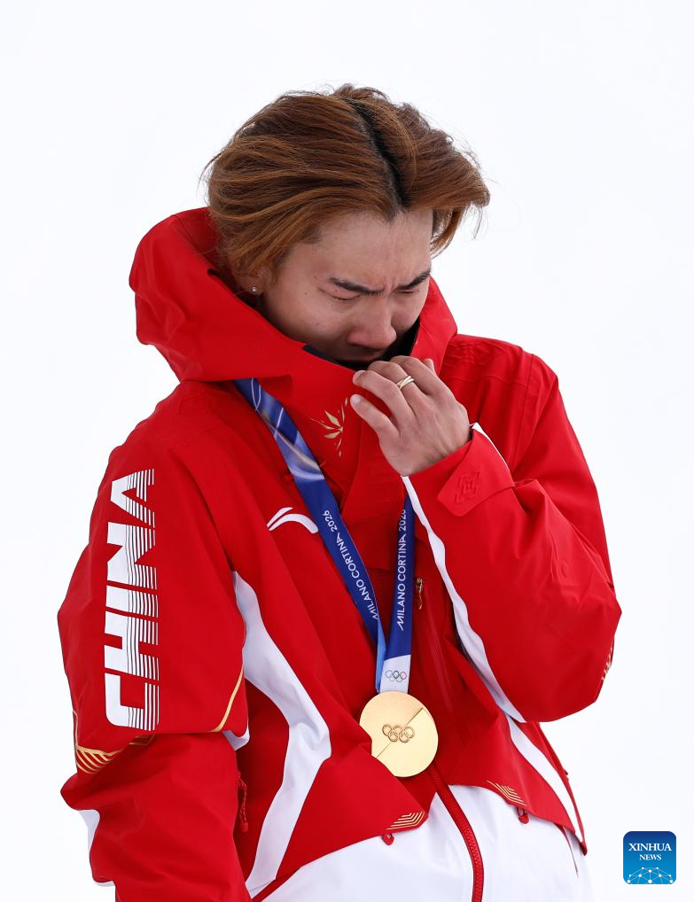 Gold medalist Su Yiming of China reacts during the awarding ceremony for the snowboard men’s slopestyle at the Milan-Cortina 2026 Olympic Winter Games in Livigno, Italy, Feb. 18, 2026. (Xinhua/Wang Peng)