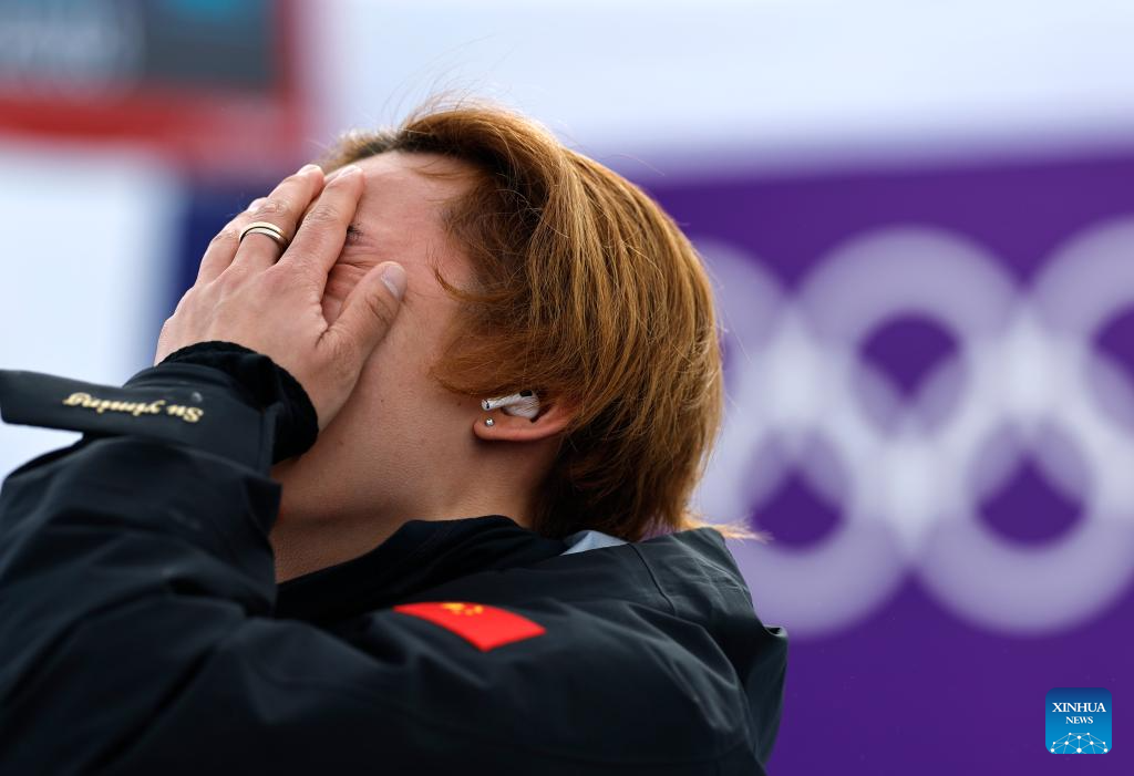 Su Yiming of China reacts after the snowboard men’s slopestyle final at the Milan-Cortina 2026 Olympic Winter Games in Livigno, Italy, Feb. 18, 2026. (Xinhua/Wang Peng)