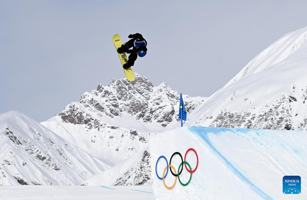 Su Yiming of China competes during the snowboard men’s snowboard slopestyle final at the Milan-Cortina 2026 Olympic Winter Games in Livigno, Italy, Feb. 18, 2026. (Xinhua/Xia Yifang)