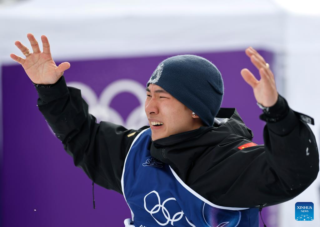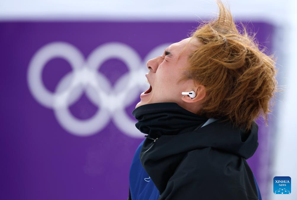 Su Yiming of China celebrates after the snowboard men’s snowboard slopestyle final at the Milan-Cortina 2026 Olympic Winter Games in Livigno, Italy, Feb. 18, 2026. (Xinhua/Wang Peng)