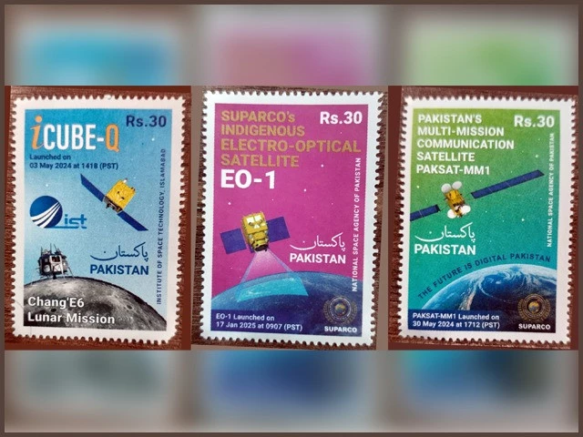 The stamps highlight the successful launches of iCube-Qamar, PAKSAT-MM1, and EO-1, representing a transformative era in Pakistan’s national space programme.