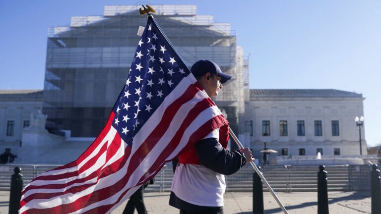 A person carrying a U.S. flag walks outside the U.S. Supreme Court, as its justices are set to hear oral arguments on U.S. President Donald Trump’s bid to preserve sweeping tariffs after lower courts ruled that Trump overstepped his authority, in Washington, D.C., U.S., November 5, 2025.