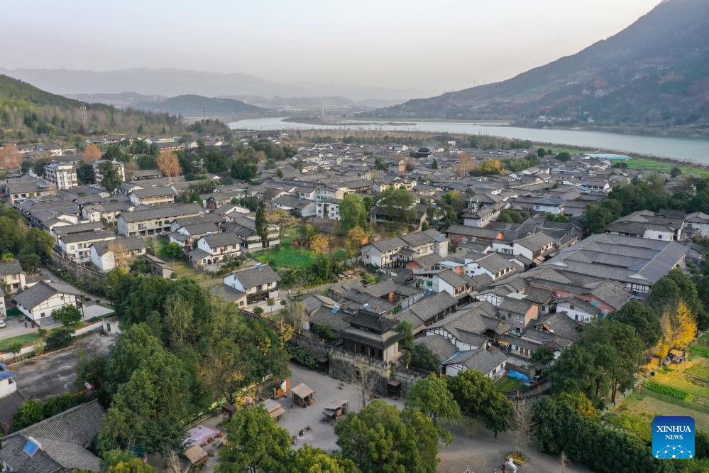 An aerial drone photo shows a view of Zhaohua ancient town in Zhaohua District of Guangyuan City, southwest China’s Sichuan Province, Dec. 13, 2025. Zhaohua ancient town, located in Guangyuan City of southwest China’s Sichuan Province, sits at the confluence of the Bailong River, the Jialing River, and the Qingjiang River. As a well-preserved ancient town, it carries a history of over 2,300 years.