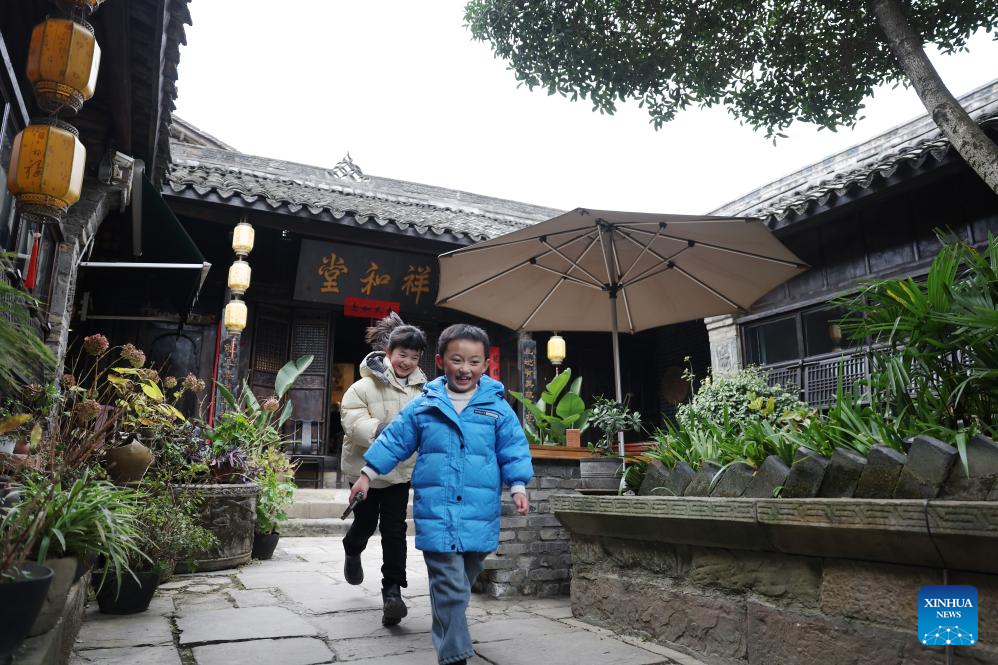 Kids play in a family inn in Zhaohua ancient town in Zhaohua District of Guangyuan City, southwest China’s Sichuan Province, Dec. 13, 2025. Zhaohua ancient town, located in Guangyuan City of southwest China’s Sichuan Province, sits at the confluence of the Bailong River, the Jialing River, and the Qingjiang River. As a well-preserved ancient town, it carries a history of over 2,300 years.