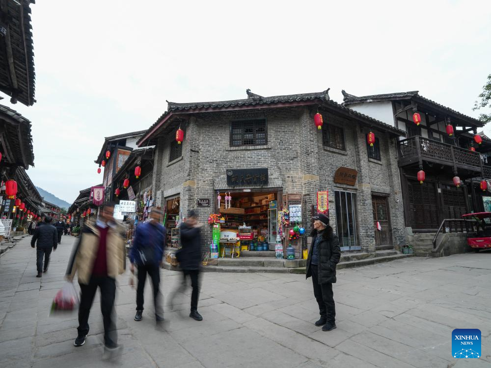 Tourists visit Zhaohua ancient town in Zhaohua District of Guangyuan City, southwest China’s Sichuan Province, Dec. 12, 2025. Zhaohua ancient town, located in Guangyuan City of southwest China’s Sichuan Province, sits at the confluence of the Bailong River, the Jialing River, and the Qingjiang River. As a well-preserved ancient town, it carries a history of over 2,300 years.