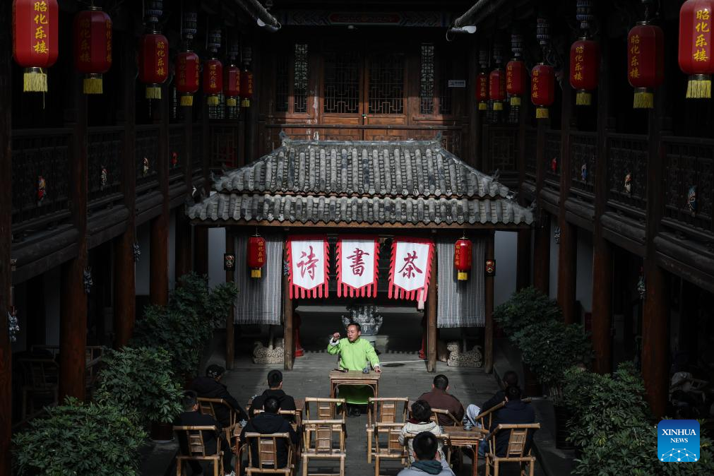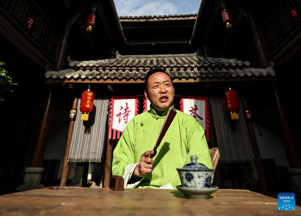 Gou Huan, an inheritor of the intangible cultural heritage of traditional Chinese storytelling, performs in Zhaohua ancient town in Zhaohua District of Guangyuan City, southwest China’s Sichuan Province, Dec. 13, 2025. Zhaohua ancient town, located in Guangyuan City of southwest China’s Sichuan Province, sits at the confluence of the Bailong River, the Jialing River, and the Qingjiang River. As a well-preserved ancient town, it carries a history of over 2,300 years.