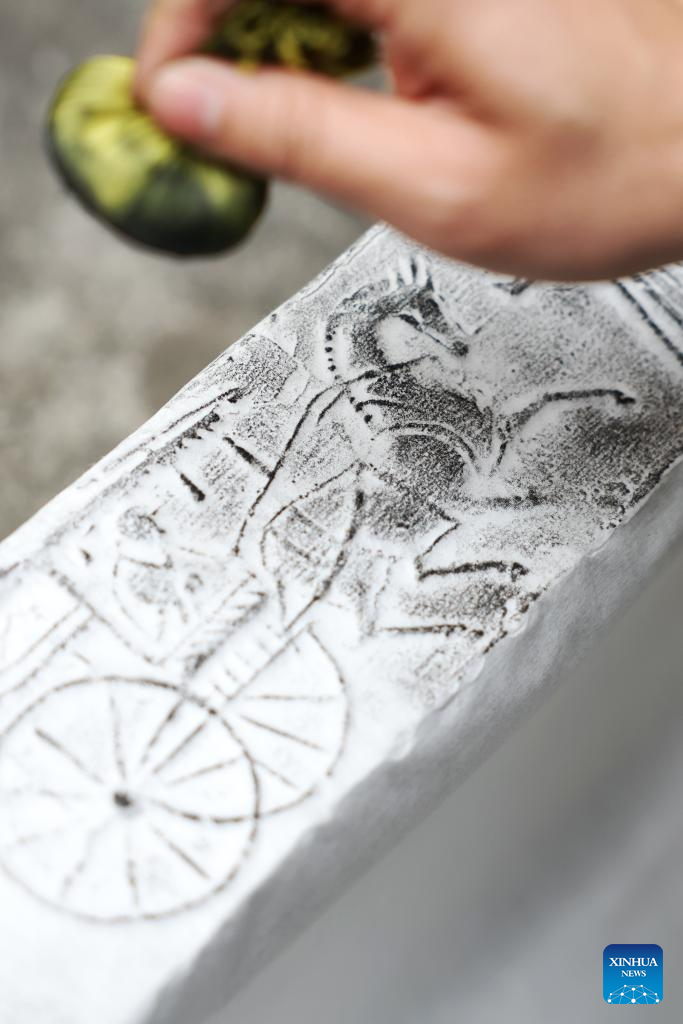 Rao Bin, a collector of bricks of Han Dynasty (202 B.C.-220 A.D.), makes rubbings of a brick at his home in Zhaohua ancient town in Zhaohua District of Guangyuan City, southwest China’s Sichuan Province, Dec. 13, 2025. Zhaohua ancient town, located in Guangyuan City of southwest China’s Sichuan Province, sits at the confluence of the Bailong River, the Jialing River, and the Qingjiang River. As a well-preserved ancient town, it carries a history of over 2,300 years.