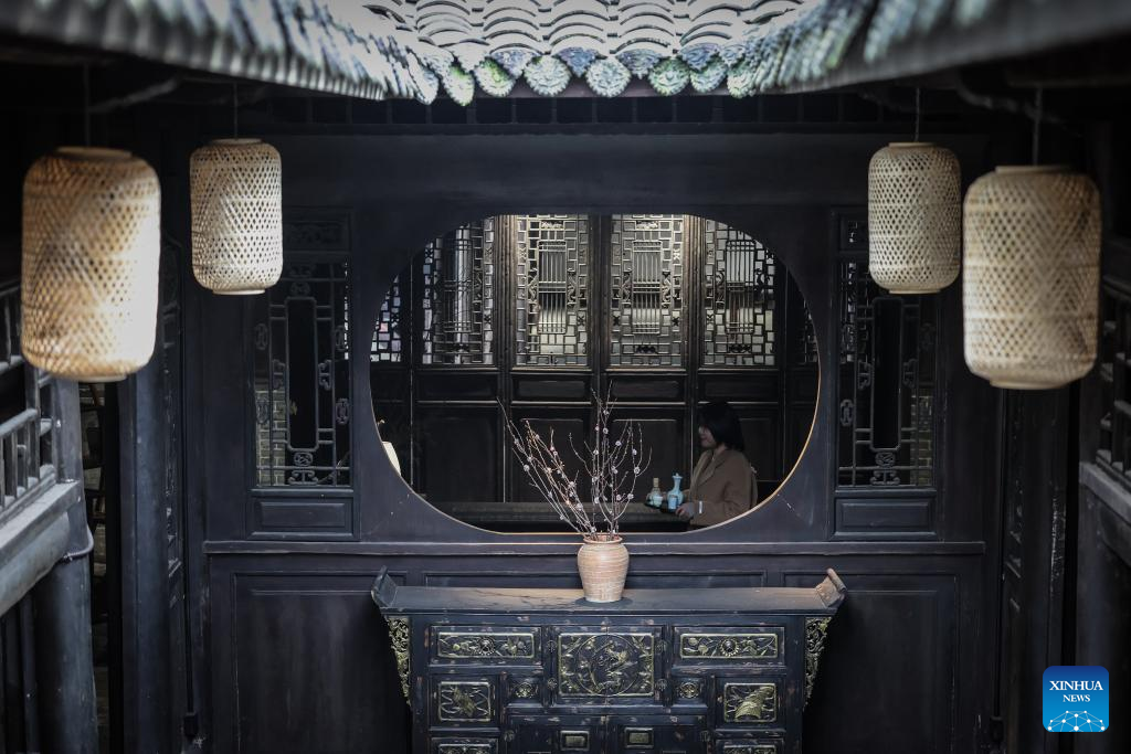 Yang Mo, a teahouse owner, works in a teahouse in Zhaohua ancient town in Zhaohua District of Guangyuan City, southwest China’s Sichuan Province, Dec. 13, 2025. Zhaohua ancient town, located in Guangyuan City of southwest China’s Sichuan Province, sits at the confluence of the Bailong River, the Jialing River, and the Qingjiang River. As a well-preserved ancient town, it carries a history of over 2,300 years.
