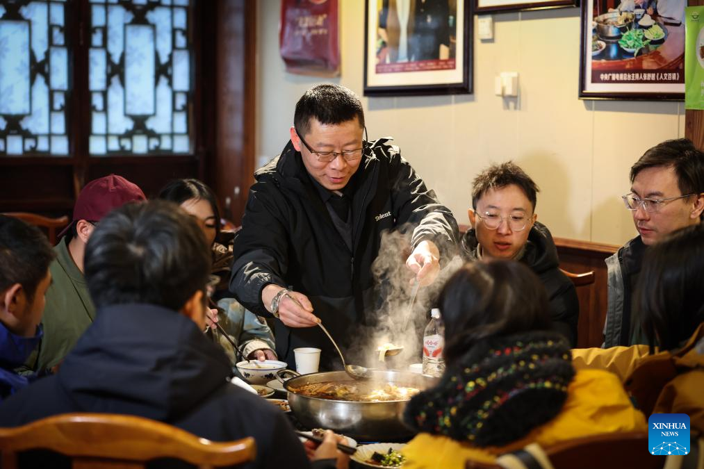 Zhai Zhigang, a restaurant owner, serves the guests in his restaurant in Zhaohua ancient town in Zhaohua District of Guangyuan City, southwest China’s Sichuan Province, Dec. 13, 2025. Zhaohua ancient town, located in Guangyuan City of southwest China’s Sichuan Province, sits at the confluence of the Bailong River, the Jialing River, and the Qingjiang River. As a well-preserved ancient town, it carries a history of over 2,300 years.