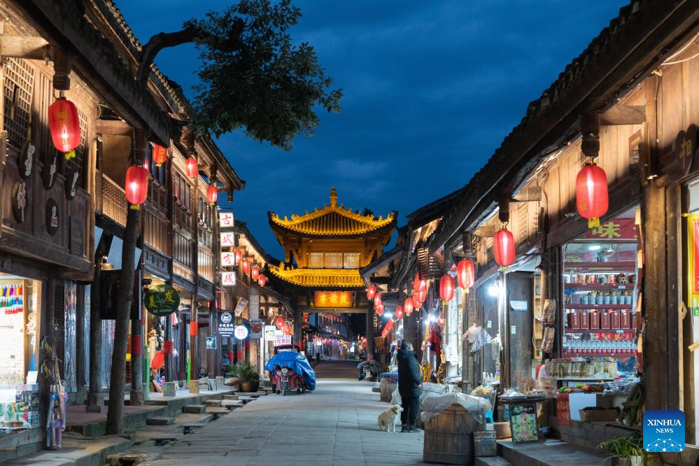 This photo shows a night view in Zhaohua ancient town in Zhaohua District of Guangyuan City, southwest China’s Sichuan Province, Dec. 12, 2025. Zhaohua ancient town, located in Guangyuan City of southwest China’s Sichuan Province, sits at the confluence of the Bailong River, the Jialing River, and the Qingjiang River. As a well-preserved ancient town, it carries a history of over 2,300 years.
