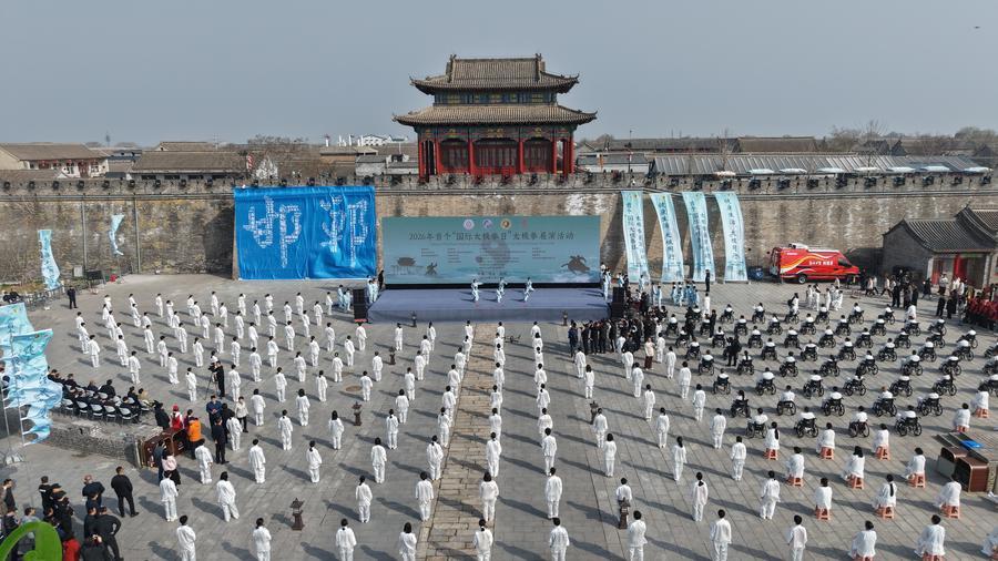 An aerial drone photo taken on March 21, 2026 shows a mass demonstration event of Taijiquan, a kind of Chinese traditional martial arts, in Yongnian District of Handan City, north China’s Hebei Province. (Xinhua)