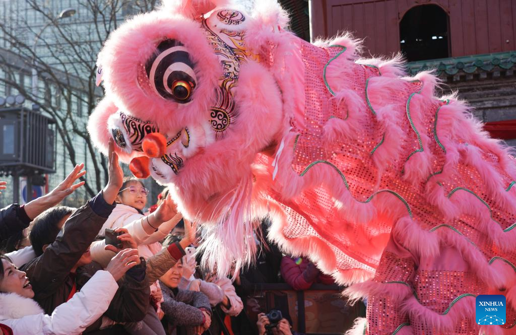 People interact with lion dance performers at a temple fair in Beijing, capital of China, Feb. 17, 2026. Temple fairs opened here celebrating the Spring Festival and presenting visitors with traditional dances, lion dances and delicious food. (Xinhua/Chen Zhonghao)