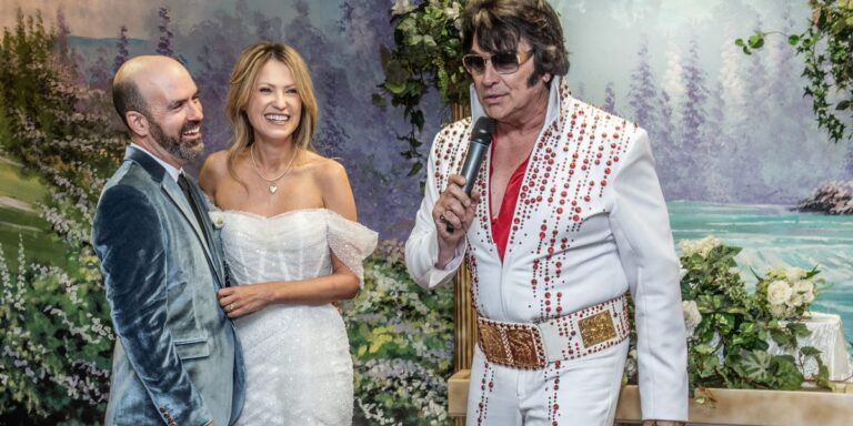 I made a reservation Little white chapel We decided to visit the famous Las Vegas wedding venue where stars like Ben Affleck and Jennifer Lopez, Bruce Willis and Demi Moore, and Frank Sinatra and Mia Farrow have been married, and we decided to get a package that included an Elvis impersonator officiating the ceremony and singing three songs. Our Elvis was, Michael Contidid a great job.