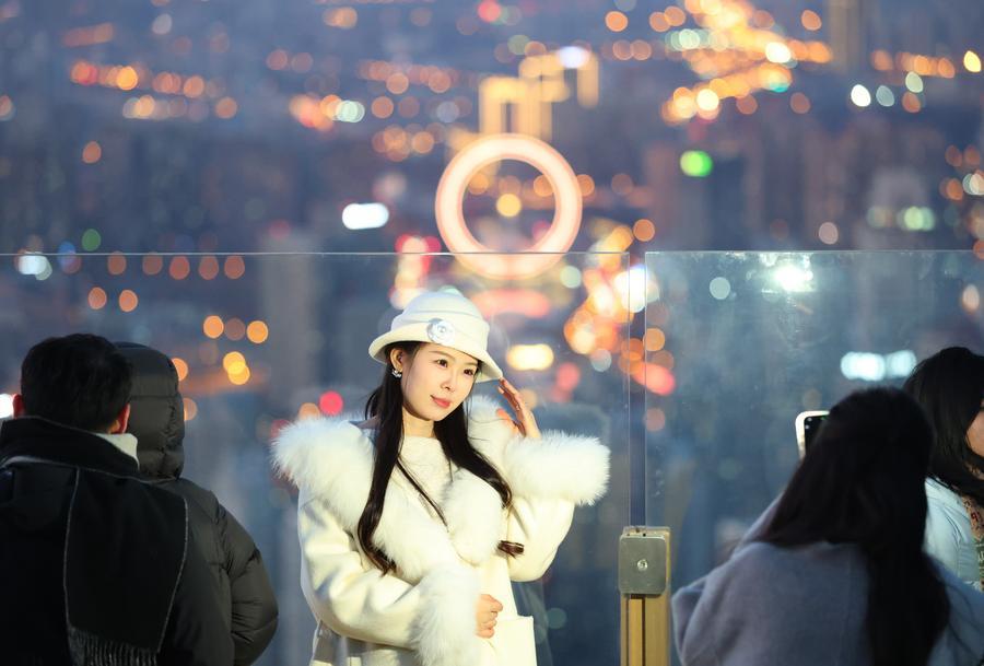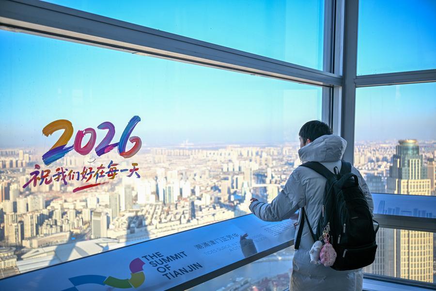A tourist enjoys the cityscape at “the Summit of Tianjin” sightseeing hall in Tianjin, north China, Jan. 1, 2026. People enjoy the cityscape of Tianjin and feel the vibrant cultural energy here to celebrate the arrival of 2026. (Xinhua/Sun Fanyue)