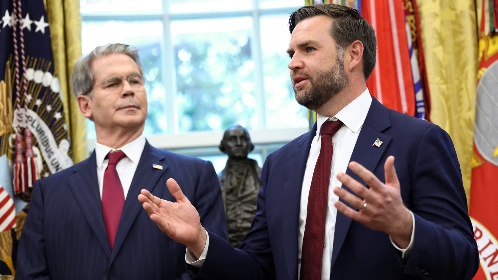 U.S. Vice President JD Vance speaks next to U.S. Treasury Secretary Scott Bessent at the White House in Washington, D.C., U.S., Sept. 25, 2025.