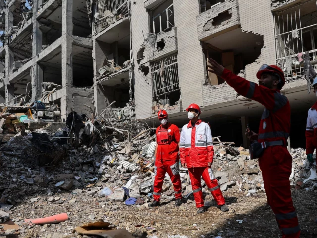 Members of a Red Crescent rescue team work at a building that was damaged by a strike, amid the U.S.-Israeli conflict with Iran, in Tehran, Iran, March 17, 2026. Majid Asgaripour/WANA (West Asia News Agency) via REUTERS