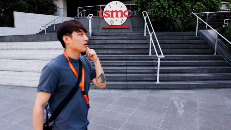 A man walks past a TSMC logo at Hsinchu Science Park in Hsinchu, Taiwan April 15, 2025.