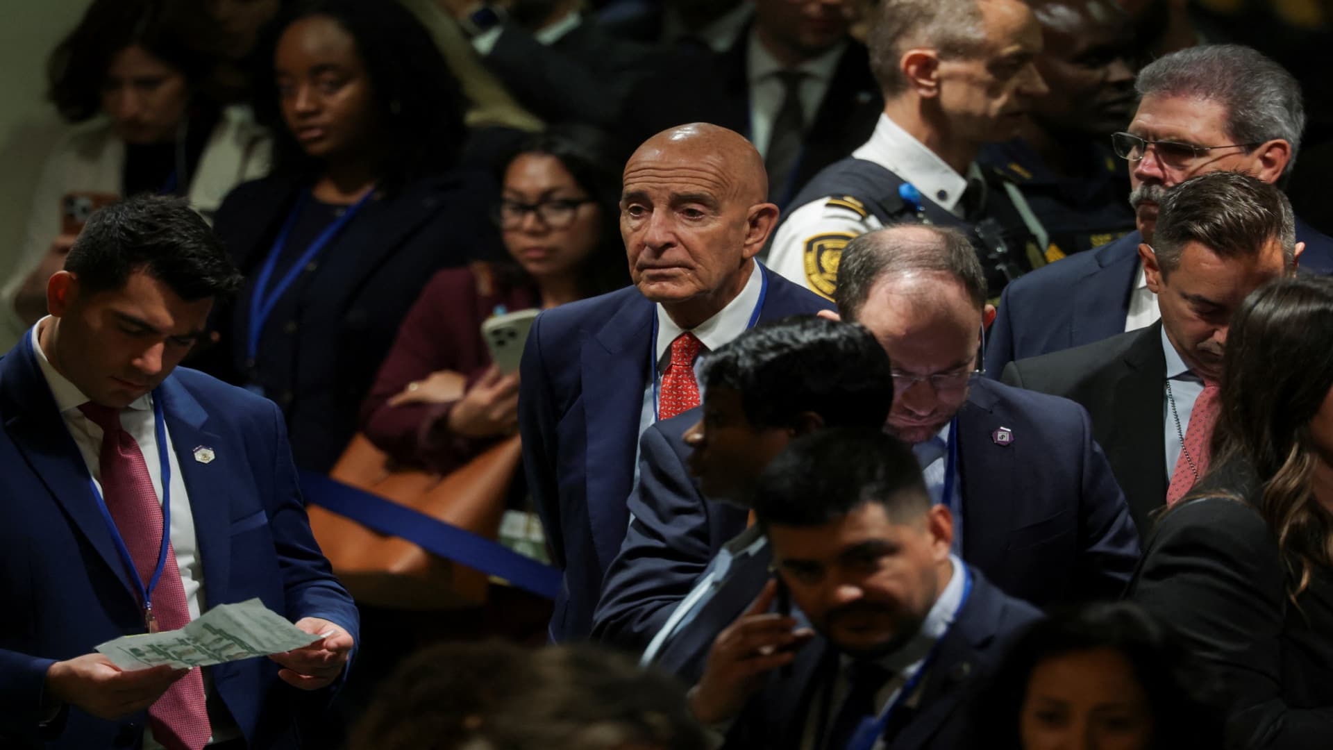 Tom Barrack, U.S. Ambassador to Turkey, waits to enter the General Assembly Hall to attend Trump’s address to the 80th United Nations General Assembly, at the U.N. headquarters in New York City on Sept. 23, 2025.