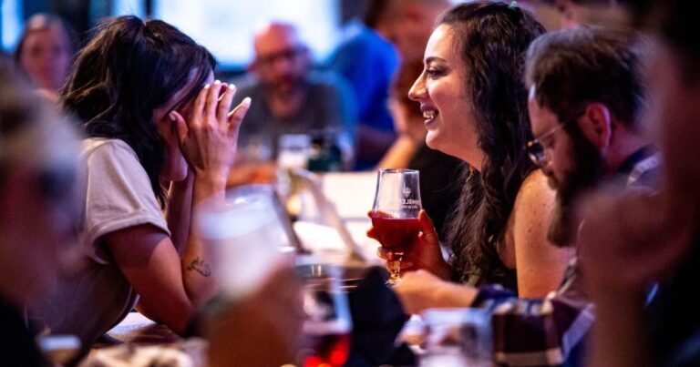 Photo by Larry Robinson/Daily Sentinel A group of friends smile and laugh as they enjoy drinks during the weekly Wednesday night trivia night at Rumblevine Brewing Company on April 17, 2024. Larry Robinson/Daily Sentinel▲