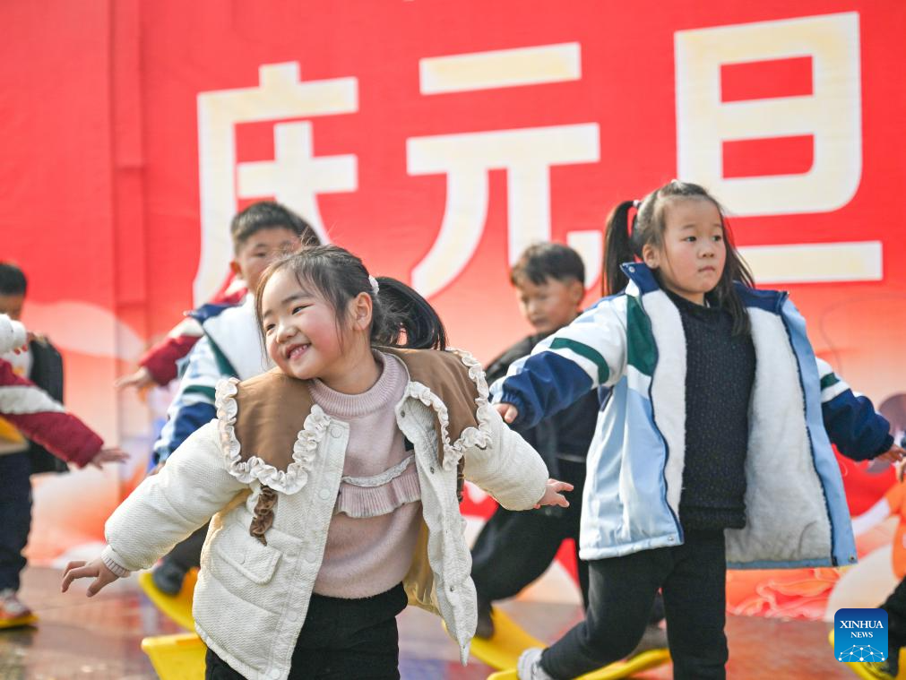 Children dance in a kindergarten in Shangqiu City, central China’s Henan Province, Dec. 29, 2025. Various activities are held across China to celebrate the upcoming new year. (Photo by Wang Gaochao/Xinhua)