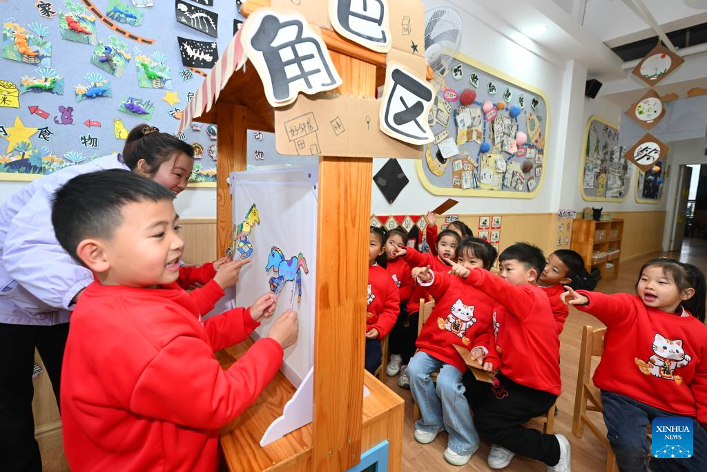 A child tries shadow puppetry in a kindergarten in Xiangyang City, central China’s Hubei Province, Dec. 29, 2025. Various activities are held across China to celebrate the upcoming new year. (Photo by Li Xuhui/Xinhua)