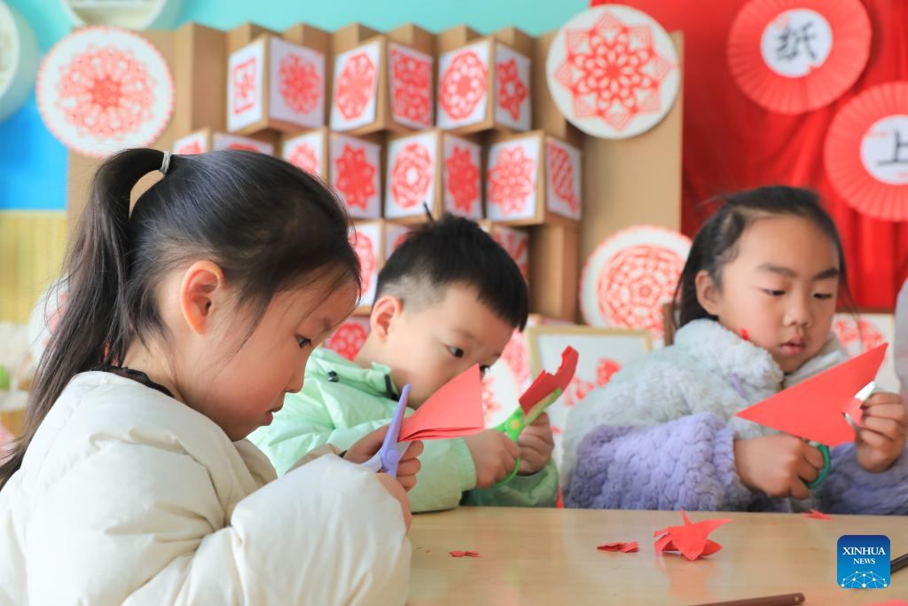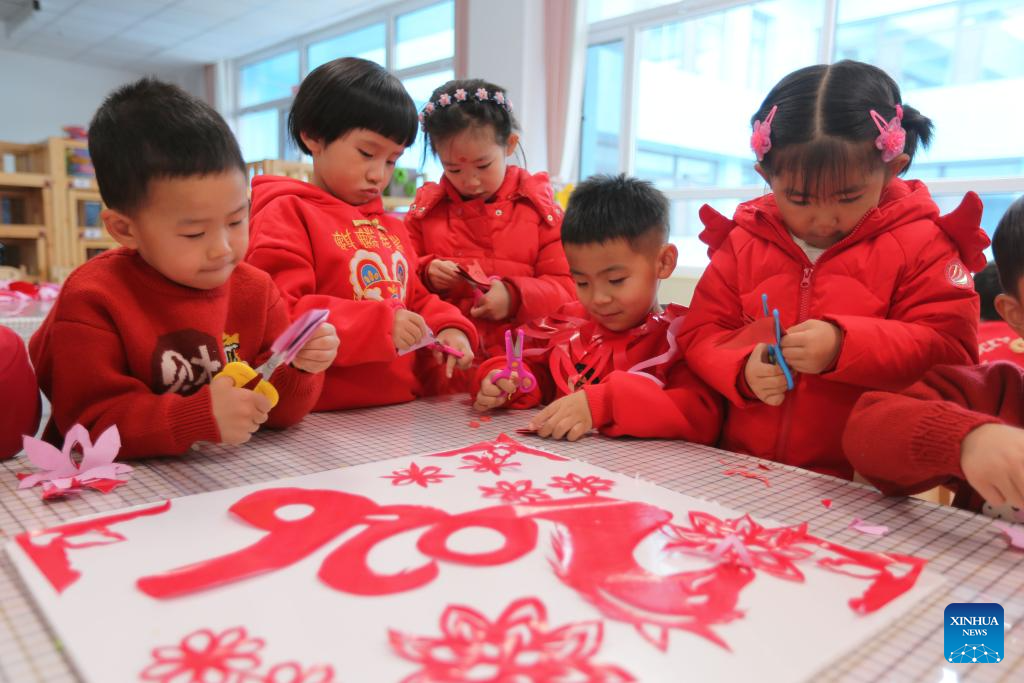 Children make paper-cut decorations in a kindergarten in Jiaozuo City, central China’s Henan Province, Dec. 29, 2025. Various activities are held across China to celebrate the upcoming new year. (Photo by Huang Fuxing/Xinhua)