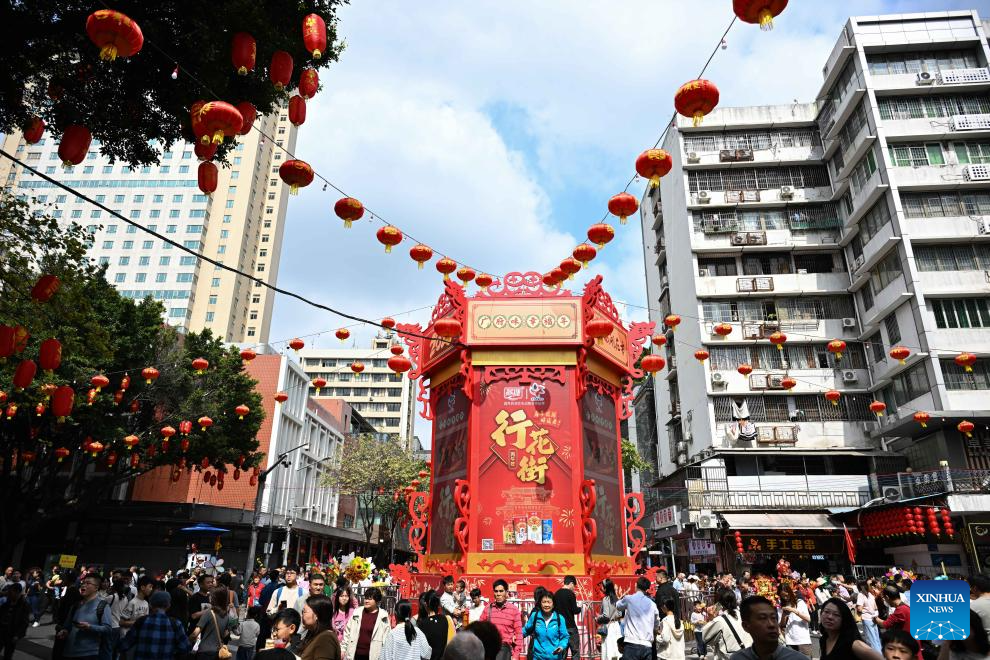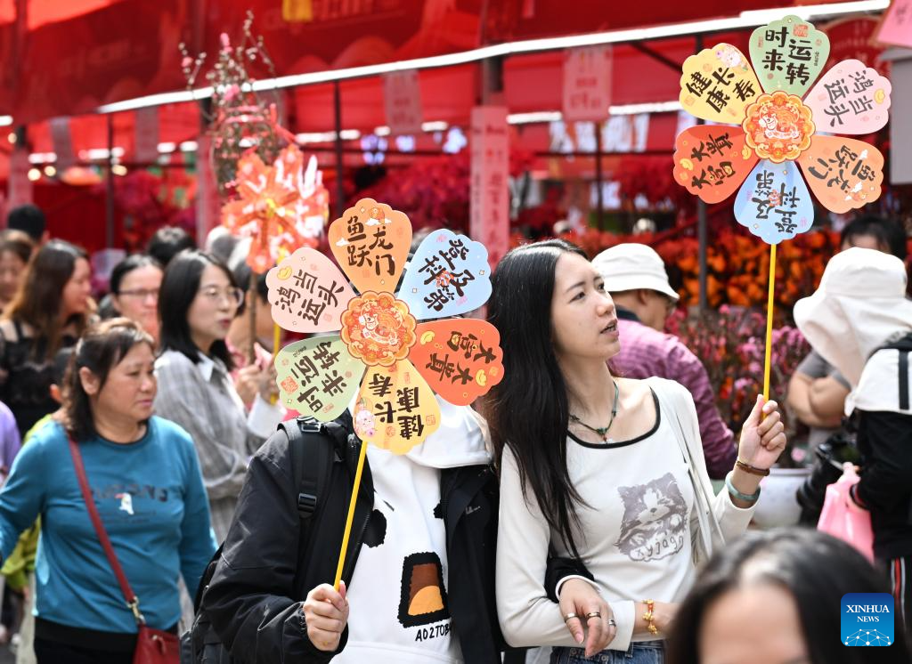 People visit a flower market in Yuexiu District, Guangzhou, south China’s Guangdong Province, Feb. 15, 2026. China is alive with vibrant celebrations with the Spring Festival just around the corner. (Xinhua/Deng Hua)