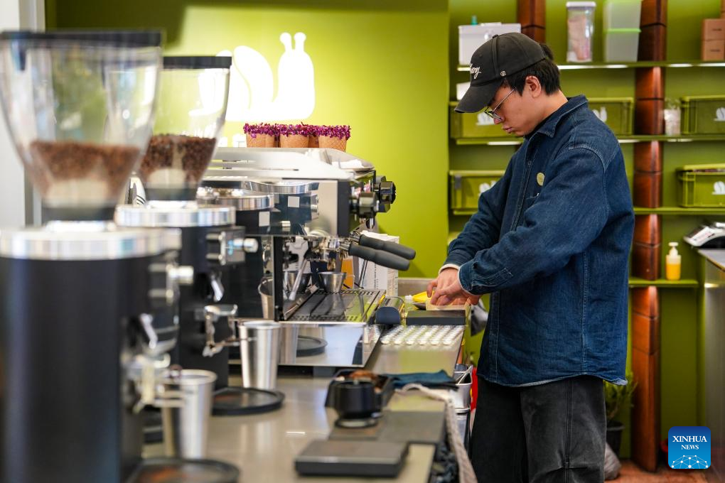 A barista makes coffee at Daguan Zhuanxin farmers’ market in Kunming, southwest China’s Yunnan Province, Jan. 27, 2026. While preserving the original function of a farmers’ market, Daguan Zhuanxin farmers’ market has now been upgraded to a complex of cultural experience, dining and entertainment, which offers tourists a window to experience local flavor and vibe. (Xinhua/Chen Xinbo)