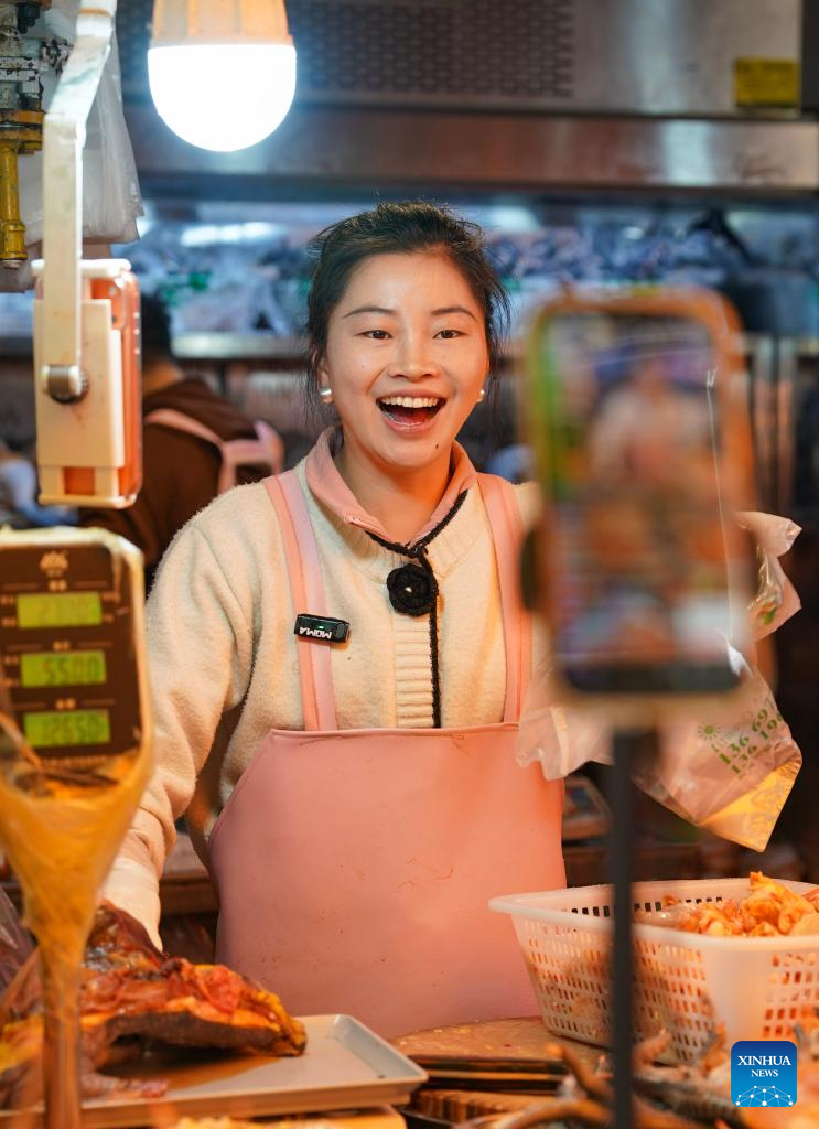 A vendor sells marinated meat at Daguan Zhuanxin farmers’ market in Kunming, southwest China’s Yunnan Province, Jan. 27, 2026. While preserving the original function of a farmers’ market, Daguan Zhuanxin farmers’ market has now been upgraded to a complex of cultural experience, dining and entertainment, which offers tourists a window to experience local flavor and vibe. (Xinhua/Chen Xinbo)