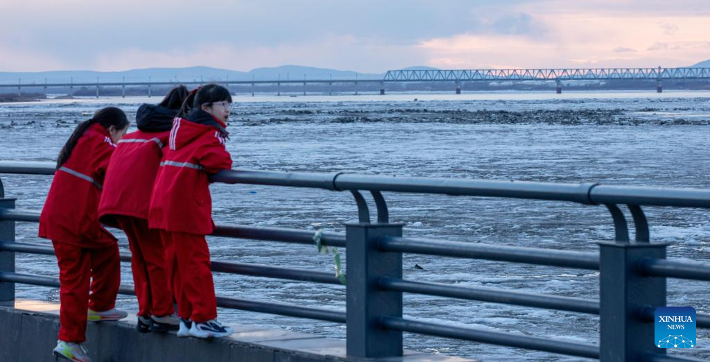 Children enjoy the view of drift ice floating on the Jiamusi section of Songhua River in northeast China’s Heilongjiang Province, April 13, 2026. Large amount of ice drifted on the surface of Heilongjiang River and Songhua River recently due to the rise of temperature. (Photo by Zhu Zongqiang/Xinhua)