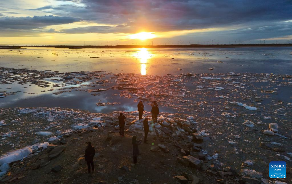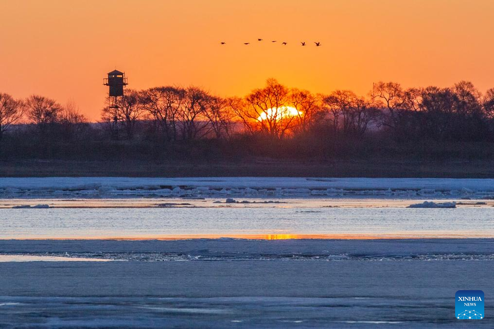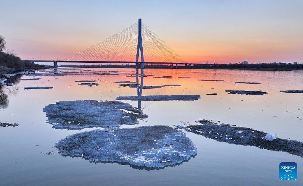 This photo taken on April 14, 2026 shows a view of drift ice floating on the Jiayin section of Heilongjiang River at sunrise in northeast China’s Heilongjiang Province. Large amount of ice drifted on the surface of Heilongjiang River and Songhua River recently due to the rise of temperature. (Photo by Li Shaojun/Xinhua)