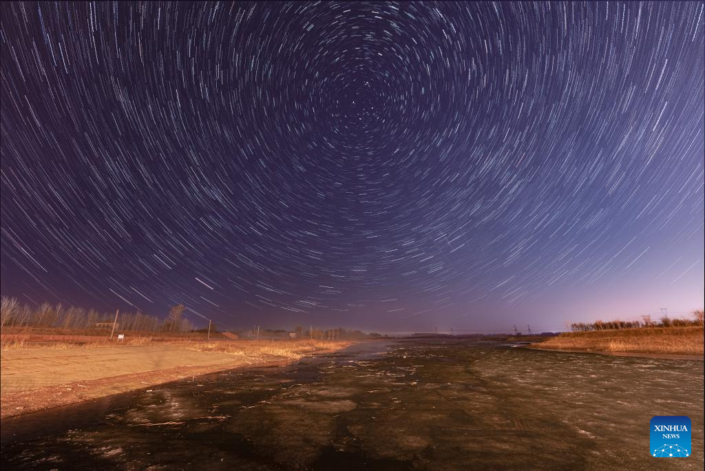 This stacked photo taken on April 14, 2026 shows a view of drift ice floating on the Harbin section of Songhua River under the starry sky in northeast China’s Heilongjiang Province. Large amount of ice drifted on the surface of Heilongjiang River and Songhua River recently due to the rise of temperature. (Photo by Liu Dapeng/Xinhua)