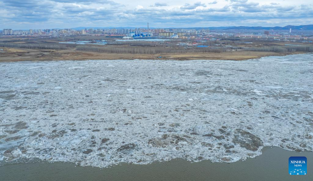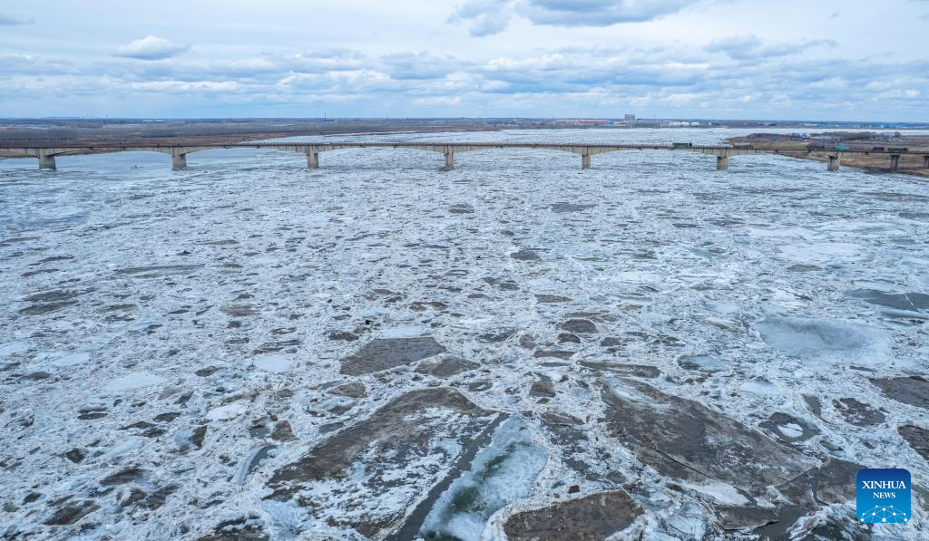 This photo taken on Apirl 13, 2026 shows a view of drift ice floating on the Jiayin section of Heilongjiang River in northeast China’s Heilongjiang Province. Large amount of ice drifted on the surface of Heilongjiang River and Songhua River recently due to the rise of temperature. (Photo by Li Shaojun/Xinhua)
