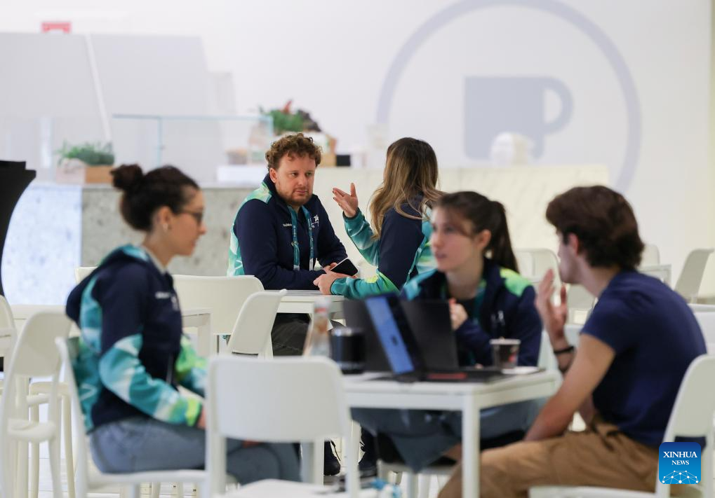 People communicate at the main media center (MMC) of the Milan-Cortina 2026 Olympic Winter Games in Milan, Italy, Jan. 28, 2026. (Xinhua/Du Xiaoyi)