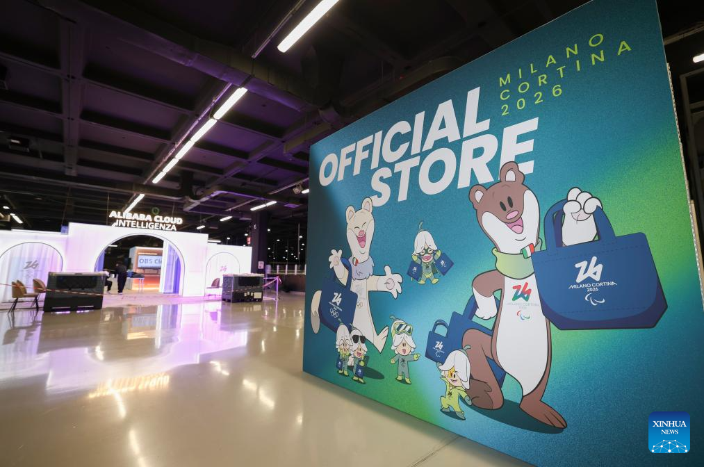 Photo taken on Jan. 28, 2026 shows a view of the official store at the main media center (MMC) of the Milan-Cortina 2026 Olympic Winter Games in Milan, Italy. (Xinhua/Hu Xingyu)
