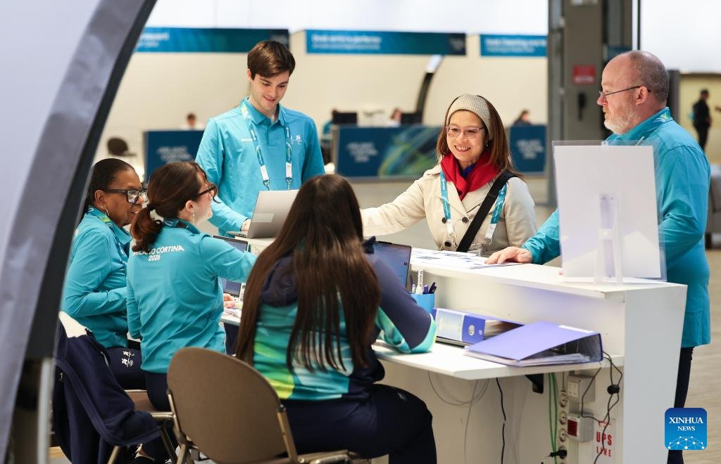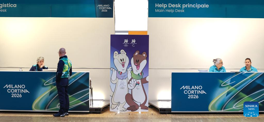 A staff works at a help desk in the main media center (MMC) of the Milan-Cortina 2026 Olympic Winter Games in Milan, Italy, Jan. 28, 2026. (Xinhua/Du Xiaoyi)