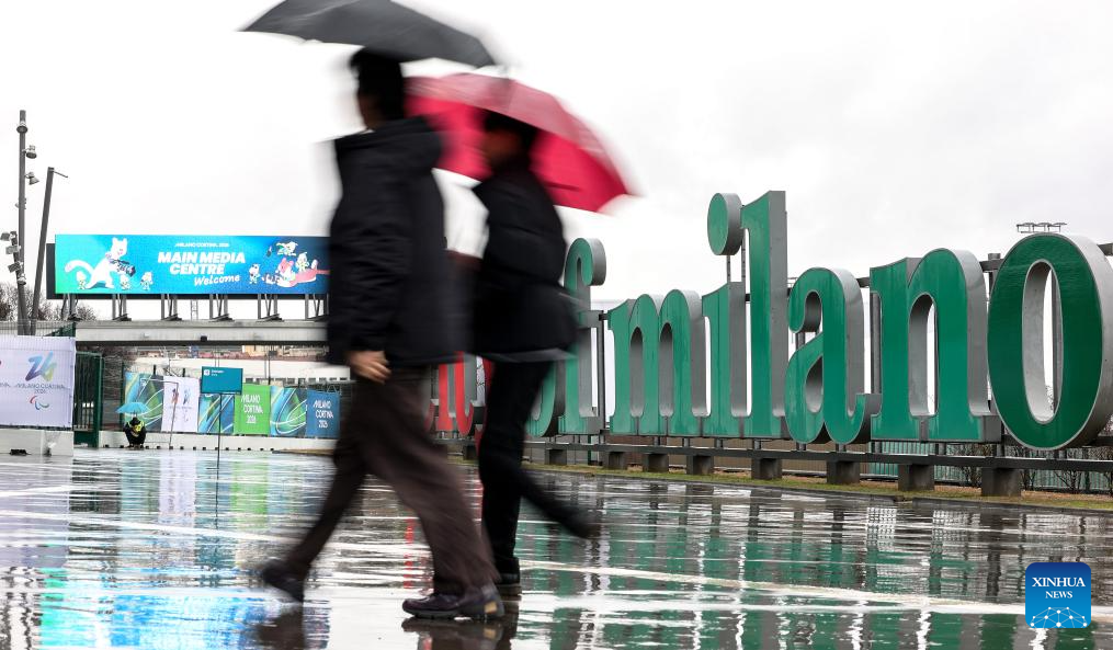 People walk to the entrance of the main media center (MMC) of the Milan-Cortina 2026 Olympic Winter Games in Milan, Italy, Jan. 28, 2026. (Xinhua/Du Xiaoyi)