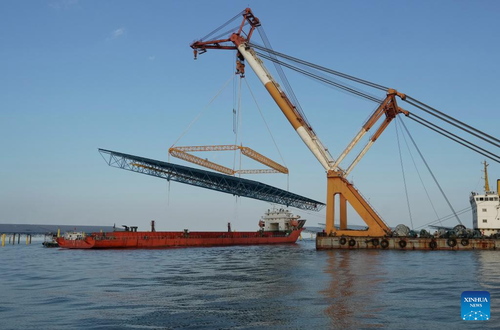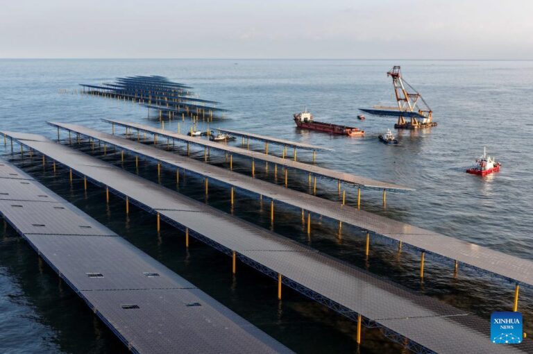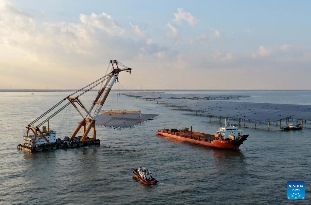 Workers operate machines at an offshore photovoltaic power station in waters off Changli County, north China’s Hebei Province, Dec. 24, 2025. (Xinhua/Yang Shiyao)