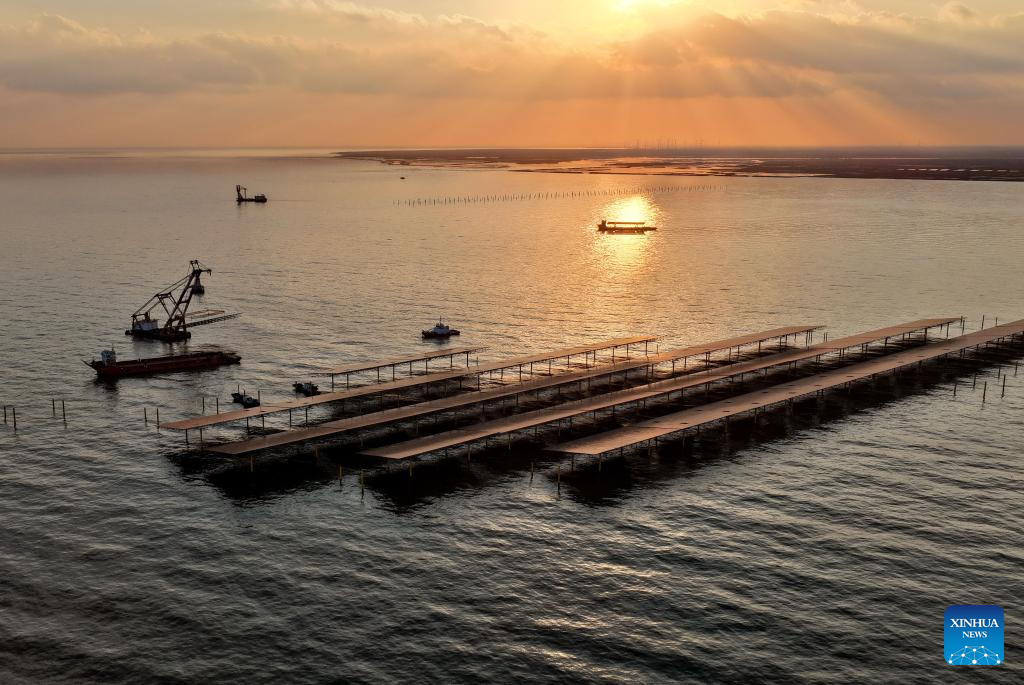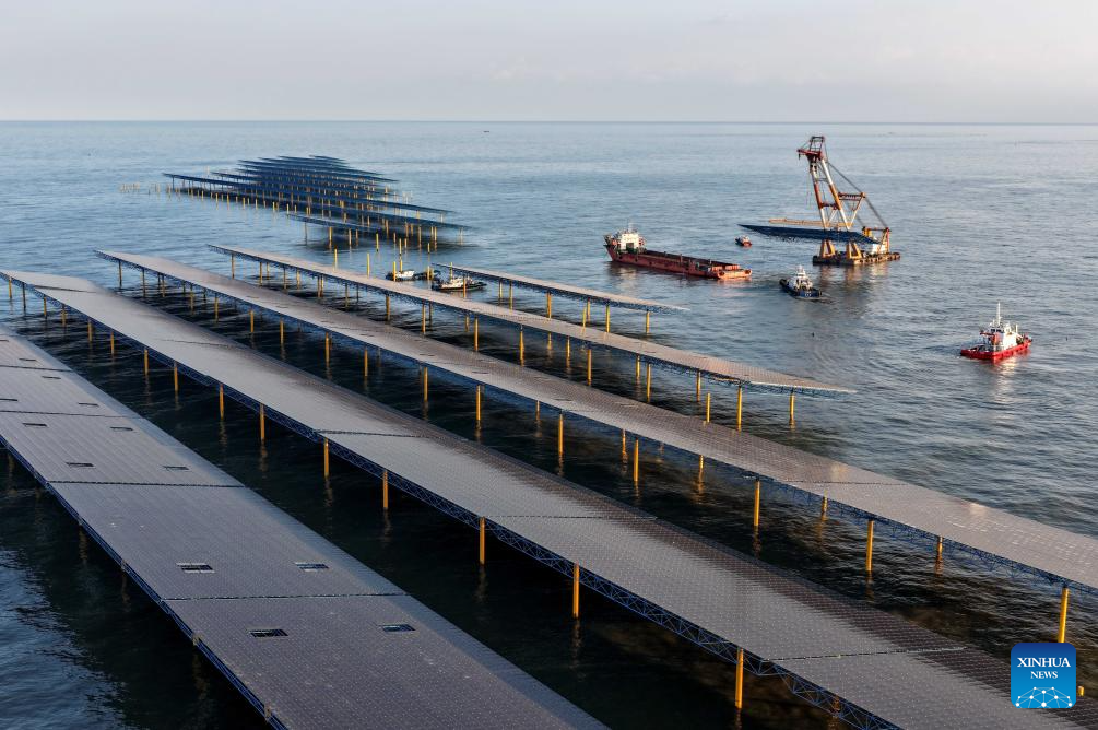A drone photo taken on Dec. 24, 2025 shows workers operating machines at an offshore photovoltaic power station in waters off Changli County, north China’s Hebei Province. (Xinhua/Yang Shiyao)